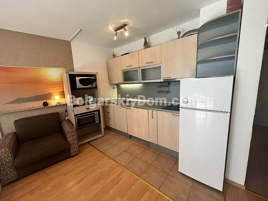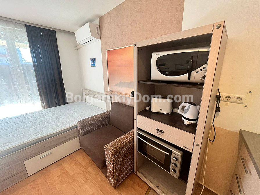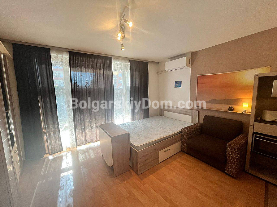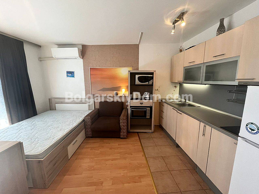 Ультраліквідна нерухомість! Новинка в каталозі «Болгарський Дім» — студія з панорамним видом на море та басейн у комплексі Панорама Форт Біч! Це зручний, готовий до проживання апартамент, де легко почуватися як удома. Продумане планування дозволяє розмістити кілька спальних місць: двоспальне ліжко та додаткова зона відпочинку з диваном, а компактний кухонний куточок знаходиться в ніші і не займає зайвого простору. Просторий балкон виходить одразу на два боки — на басейн комплексу та на море, яке знаходиться всього в 200 метрах. Загальна площа — 45 кв.м., розташована на комфортному поверсі, повністю мебльована, у хорошому стані. Встановлена вся необхідна техніка, ремонт виконаний якісно, інтер’єр — світлий і приємний. Чудовий варіант як для себе, так і для здачі в оренду в сезон.