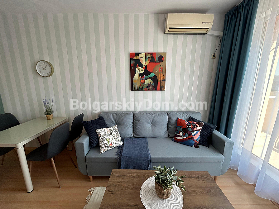 Сучасна двокімнатна квартира в комплексі “Sunny Day 6”, Сонячний Берег Пропонується до продажу затишна та стильно оформлена квартира площею 54 м², розташована на четвертому поверсі житлової будівлі без ліфта у популярному комплексі “Sunny Day 6”. Комплекс знаходиться всього за 4 км від пляжу та центру курорту Сонячний Берег. Район вирізняється розвиненою інфраструктурою та зручним транспортним сполученням, що робить проживання тут комфортним. Квартира включає простору вітальню з кухонною зоною, окрему спальню, ванну кімнату та балкон. Житло повністю мебльоване та оснащене побутовою технікою, тому ідеально підходить для негайного заселення або здачі в оренду.