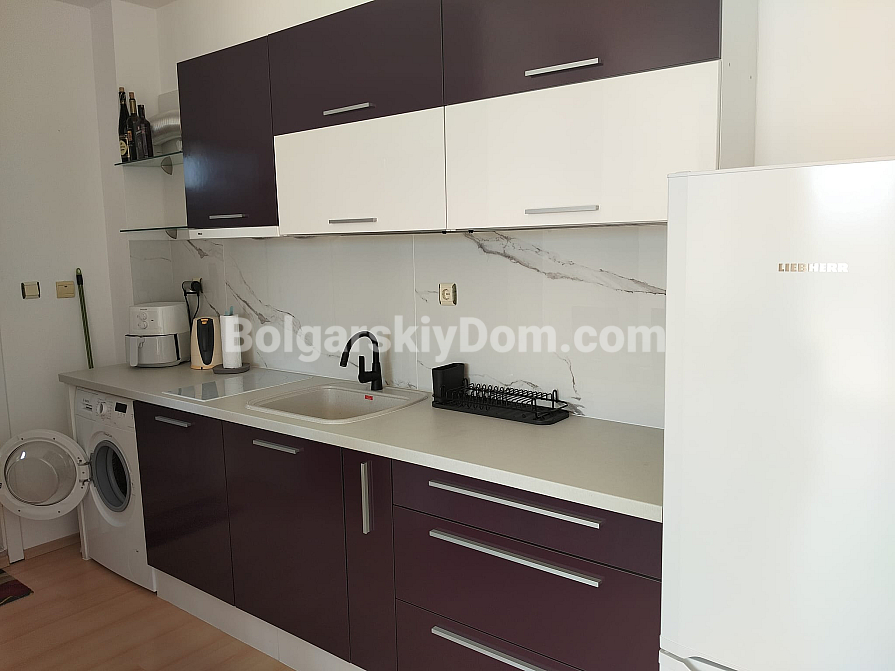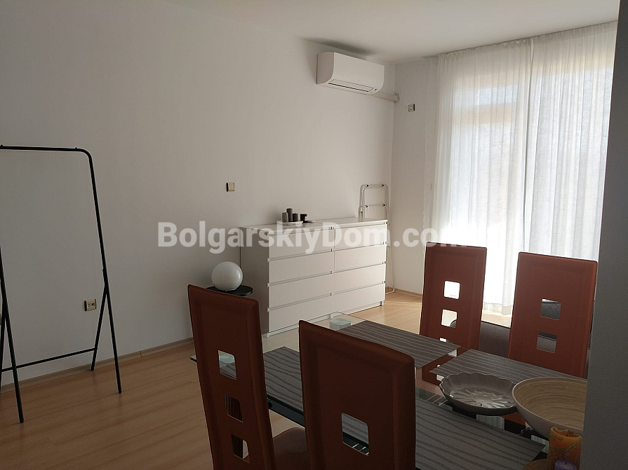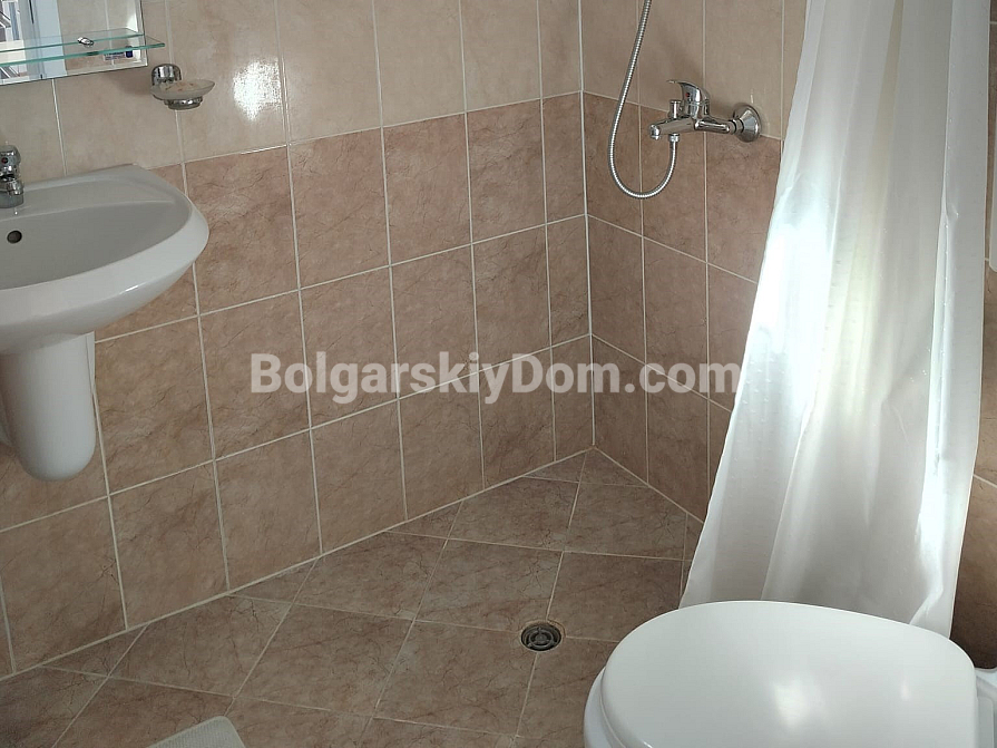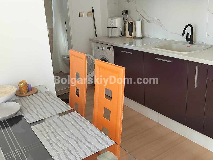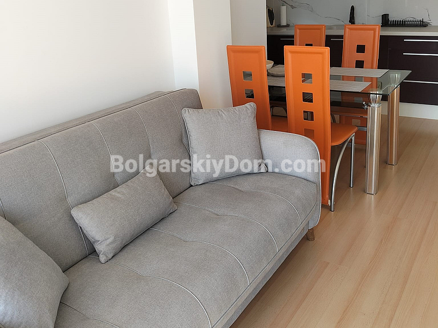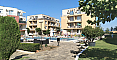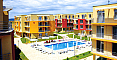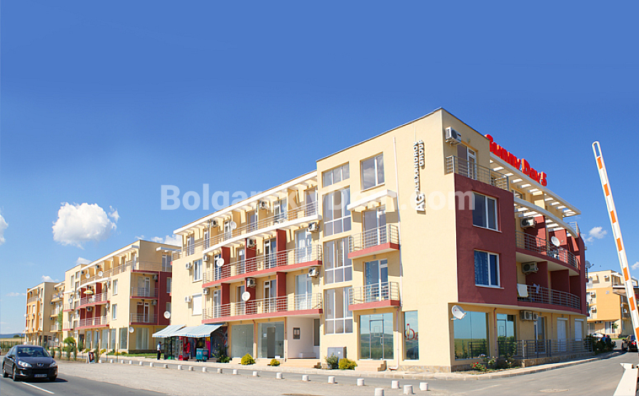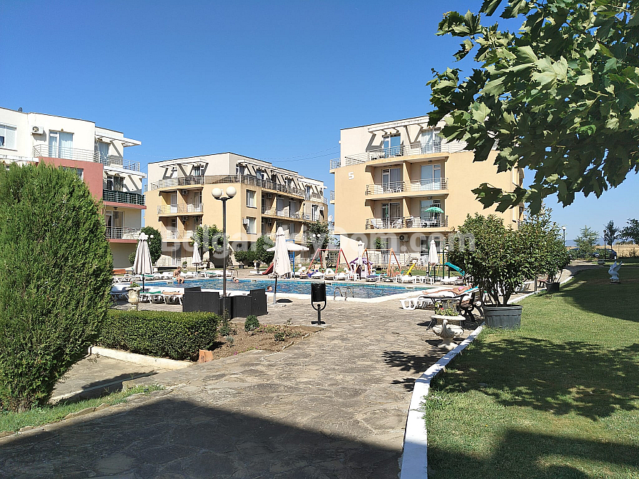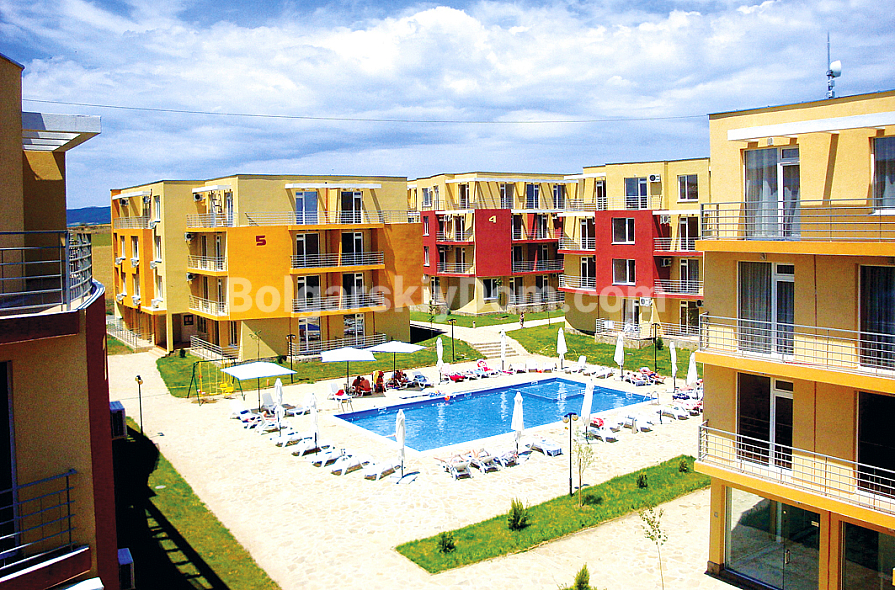 Sunny Day 5 розташований у спокійній і зеленій частині Сонячного Берега, за 4 км від пляжу, де доступні водні види спорту, атракціони та розваги. Комплекс з контролем доступу має такі зручності, як великий басейн з шезлонгами, дитячий майданчик, критий паркінг та пішохідні доріжки з доглянутими газонами. Річна такса 580 євро покриває утримання території. Центр курорту за 10 хвилин їзди, у сезон доступний трансфер.