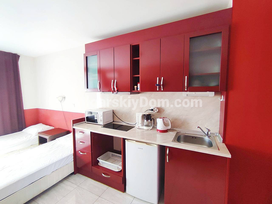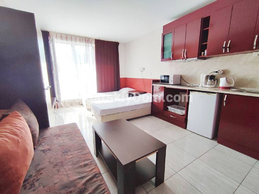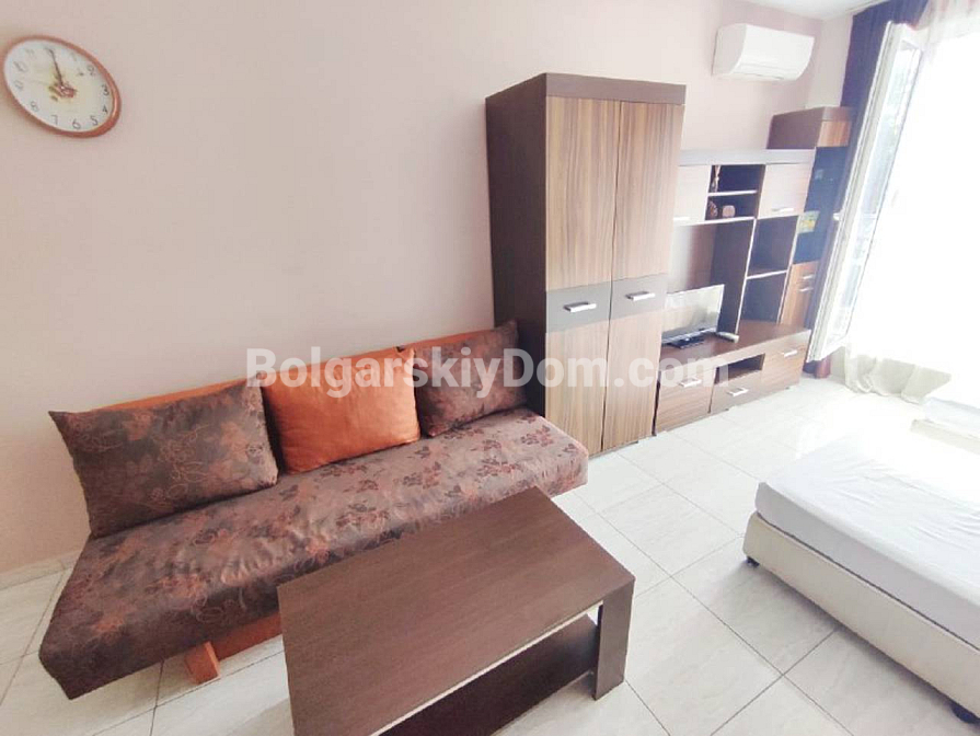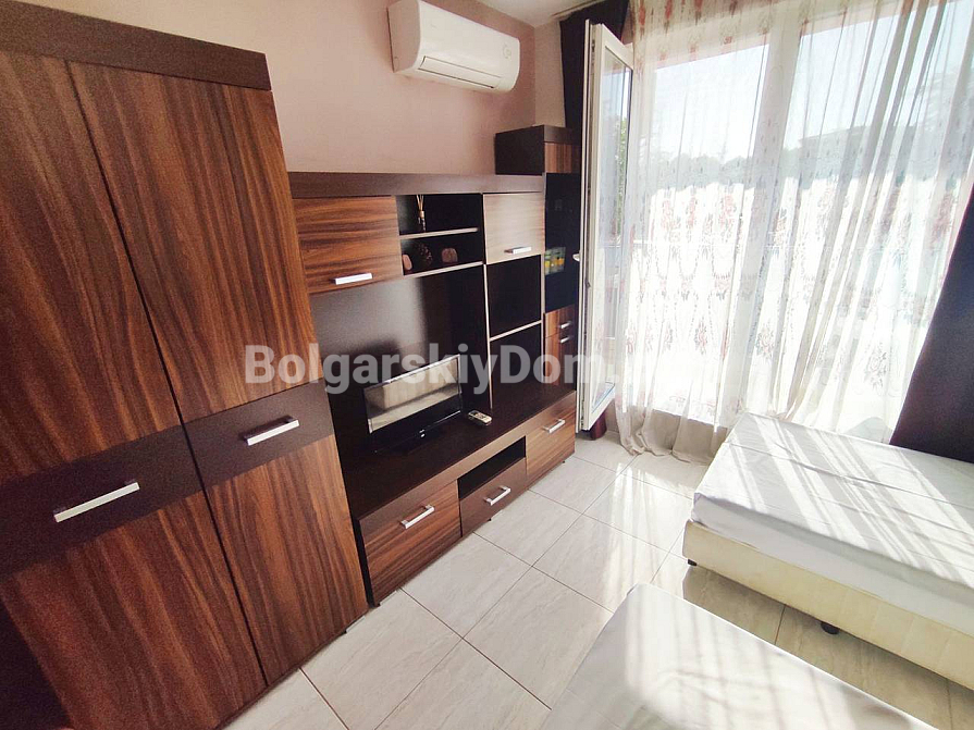 Нова приваблива пропозиція від "Болгарського Дому" - функціональна студія площею 36 кв.метрів з балконом в сучасному комплексі Сонячного берега. Це ваша можливість жити всього в двох хвилинах від піщаного пляжу або вигідно інвестувати кошти в нерухомість. Переваги об'єкта: затишний 2 — й поверх, вид на тиху вулицю (без шуму від басейну); повністю мебльована і обладнана технікою — заїжджай і живи; побутовий тариф на електрику - економія на рахунках; відмінна локація-пару хвилин до центру курорту з його різноманітною інфраструктурою.