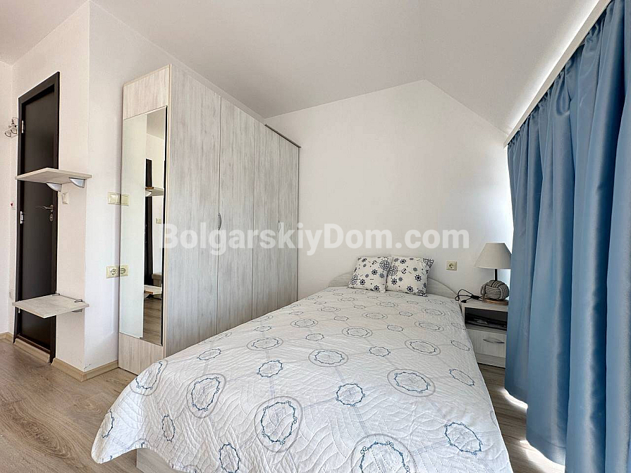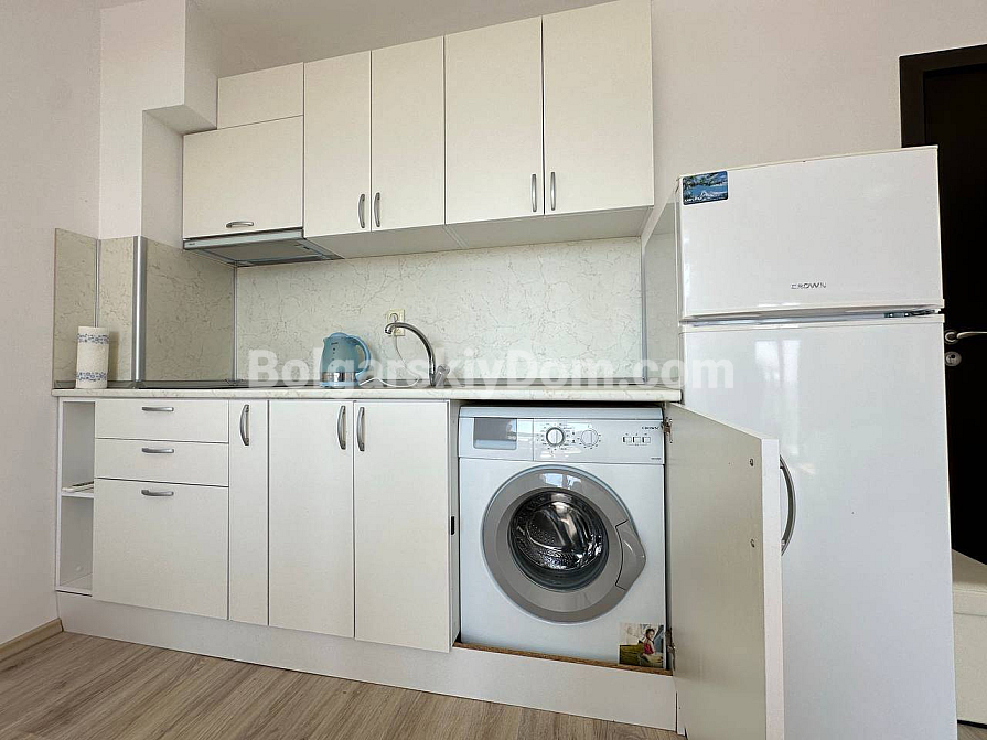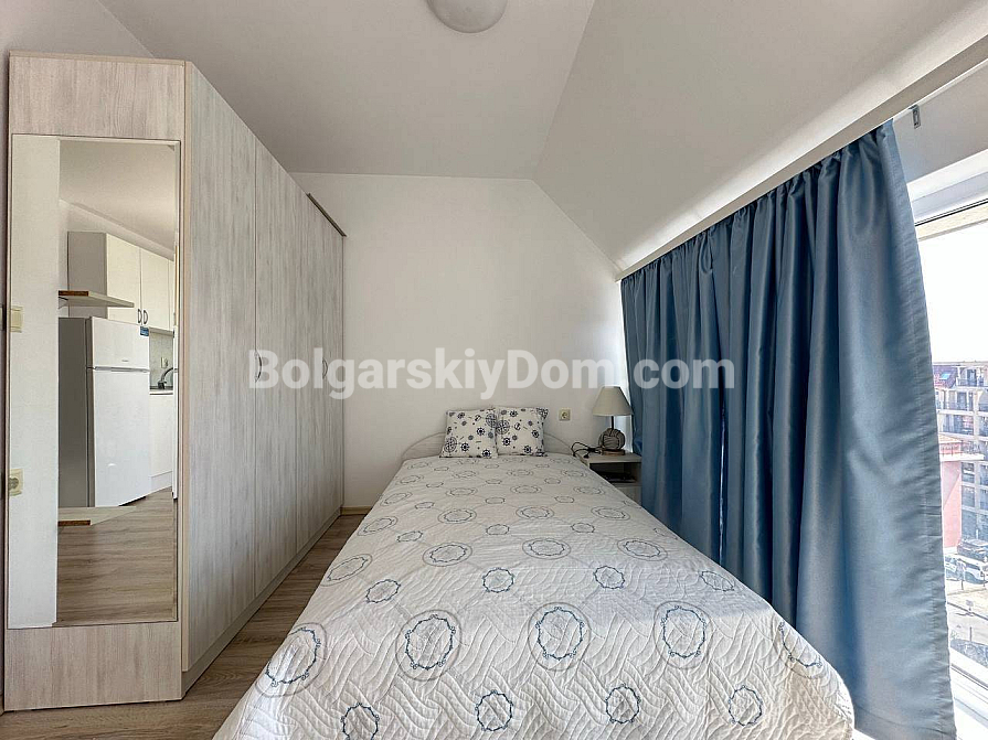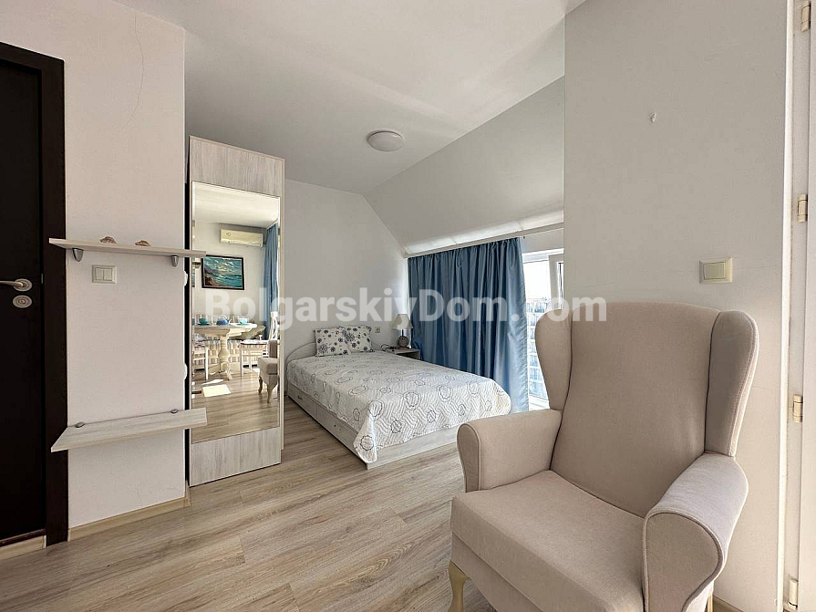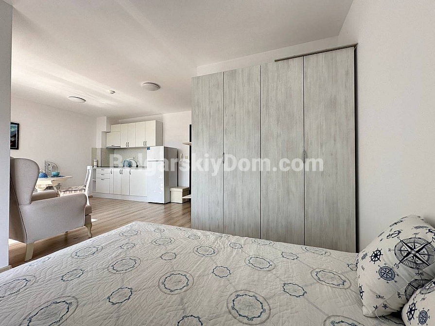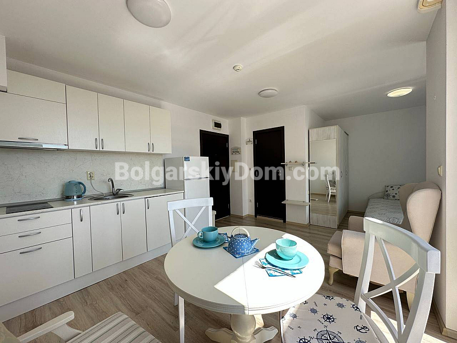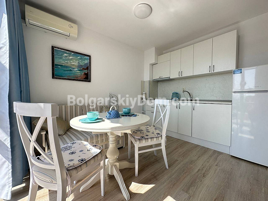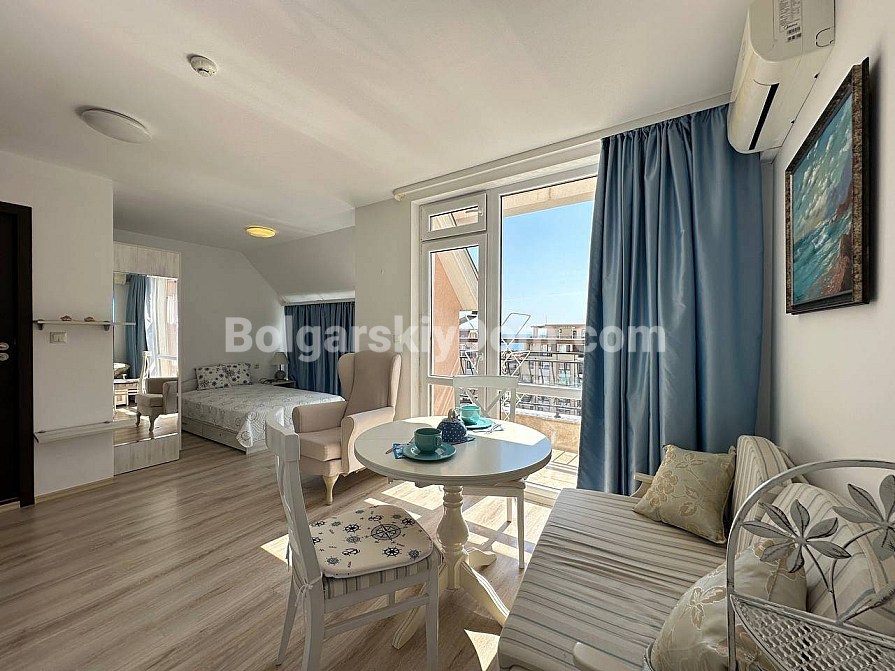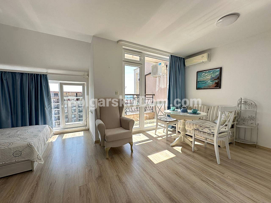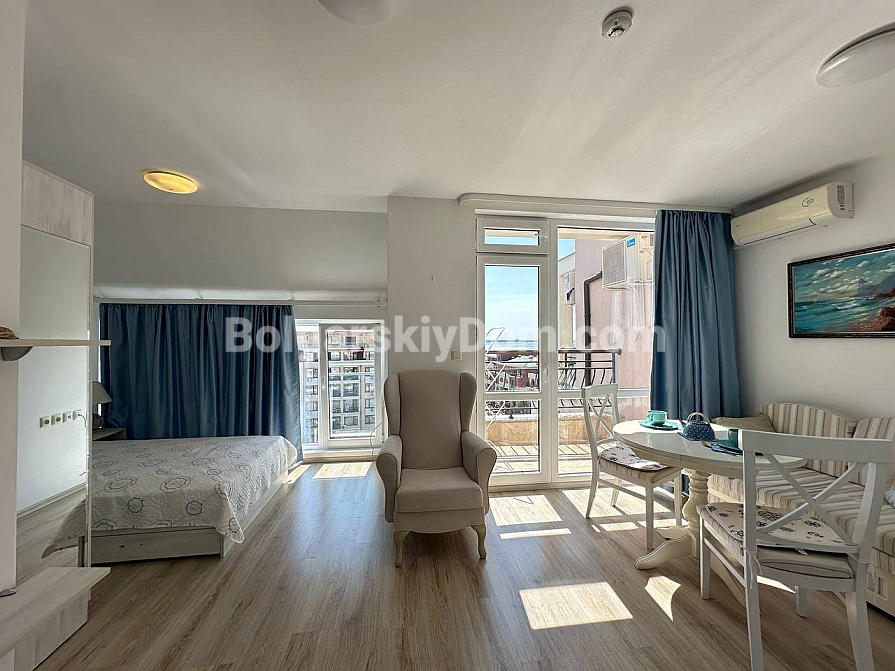 Бажаєте зануритися в атмосферу моря, не виходячи з дому? Тоді ця пропозиція для вас! Світла і затишна студія в Святому Власі, розташована на шостому поверсі з семи, готова прийняти своїх нових господарів. Дуже цікаво обігране планування - вітальня візуально розділена на дві частини: велика кухонна зона разом з обідньою, і окремо міні-спальня. Інтер'єр виконаний в елегантних біло-блакитних відтінках, що створюють відчуття легкості і гармонії. Простір буквально наповнений світлом і натхненням. Головне достоїнство апартаменту - вражаюча морська панорама, якою ви можете насолоджуватися і з тераси, і навіть не встаючи з ліжка.
