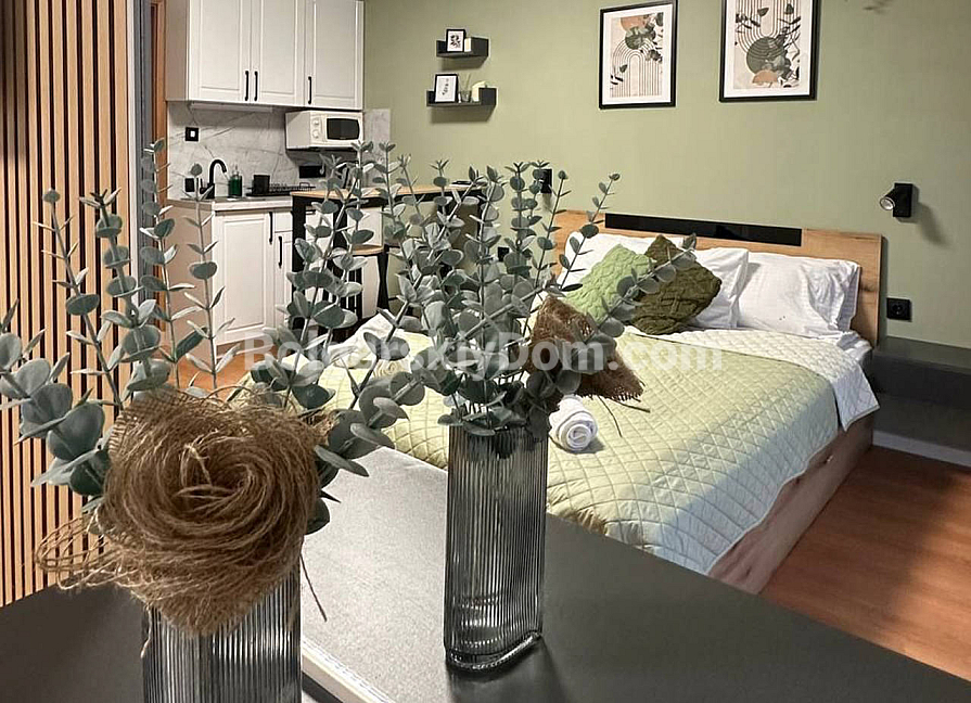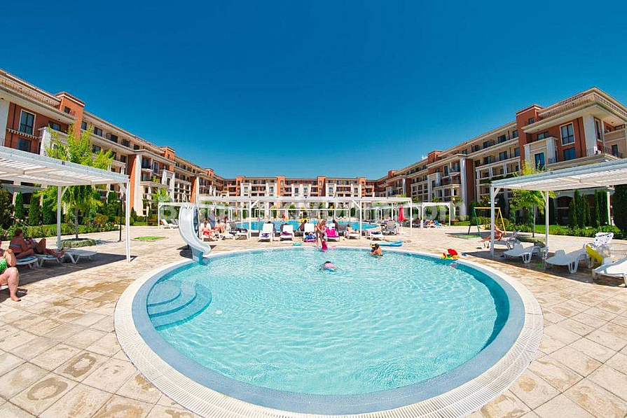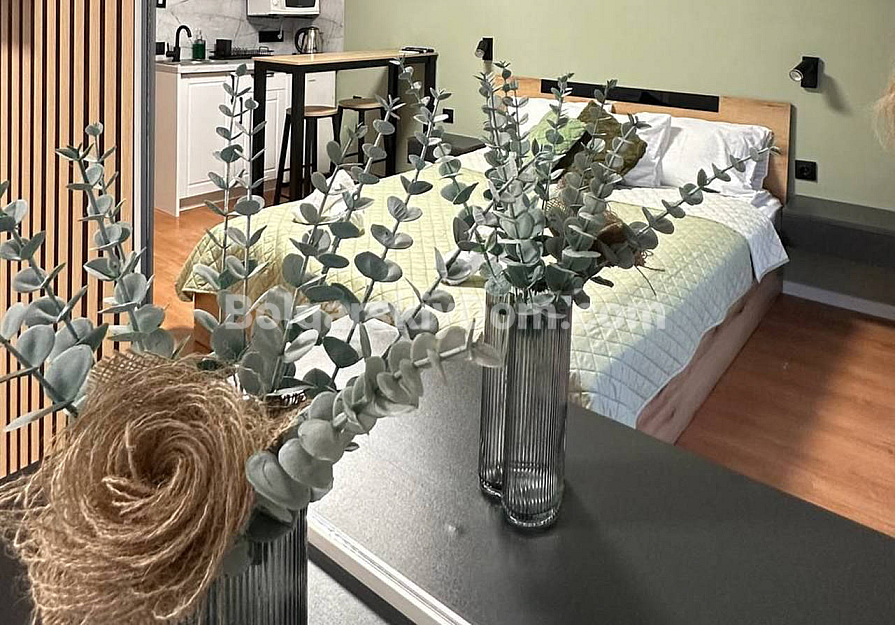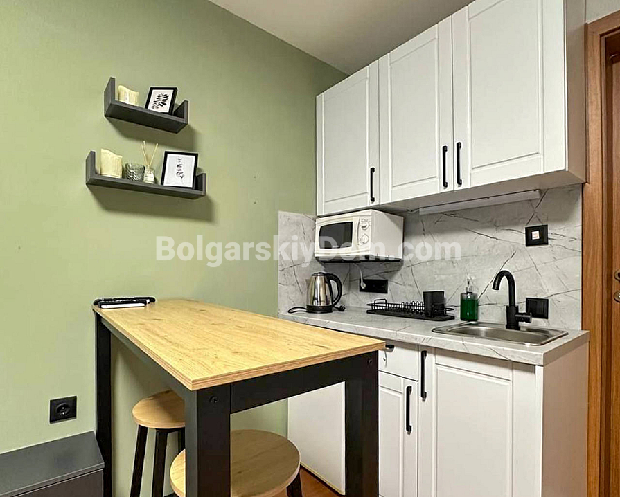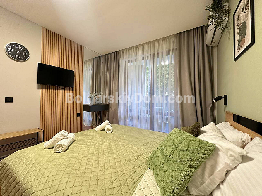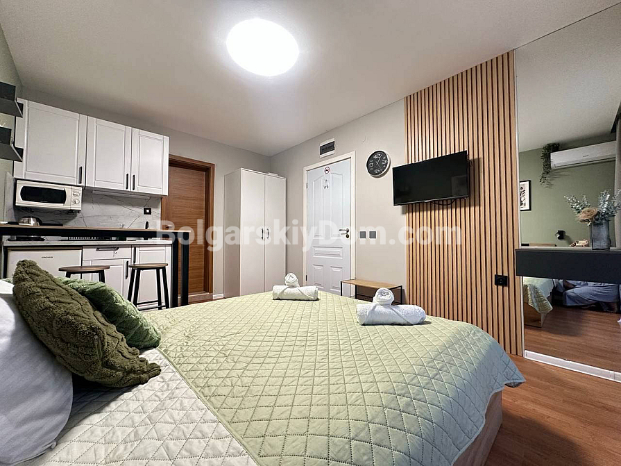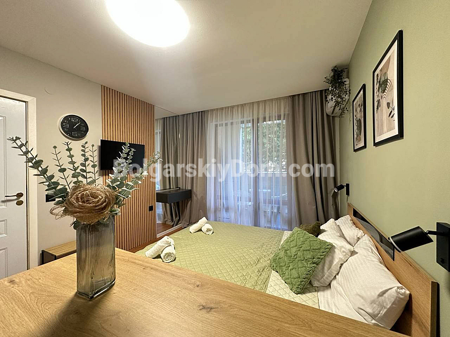 Зверніть увагу на цю стильну студію біля моря в комплексі класу люкс в Святому Власі! Квартира площею 34 кв. метра тільки після ремонту. Все продумано до дрібниць: сучасний інтер'єр витриманий в приємних зелених тонах, зручне зонування - кухонна зона візуально відокремлена від спальної барною стійкою, якісні меблі і повністю обладнаний санвузол. Є затишна тераса, прихована від сторонніх очей густою зеленню. Тут приємно випити ранкову каву або насолоджуватися свіжим повітрям. Ця квартира - рідкісна знахідка для тих, хто планує заробляти на оренді, тому що завдяки всім своїм перевагам має високий рентний потенціал.