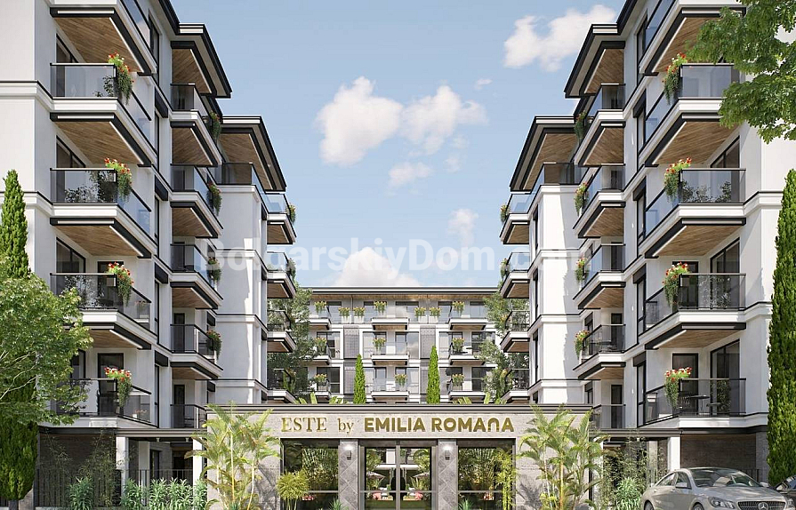 Комплекс Емілія Романа Есте є частиною масштабного житлового проєкту, розташованого в тихій і зеленій зоні Сонячного Берега, всього за 1 км від моря. На його великій території будуть цілорічний фітнес-центр із СПА-зоною, кілька тематичних басейнів, ресторани, доглянуті сади та дитячі майданчики. Цілодобова охорона, відеоспостереження та наявність підземного паркінгу — звичні, але важливі аспекти для інвесторів. Річна такса підтримки становить 16 євро за квадратний метр.