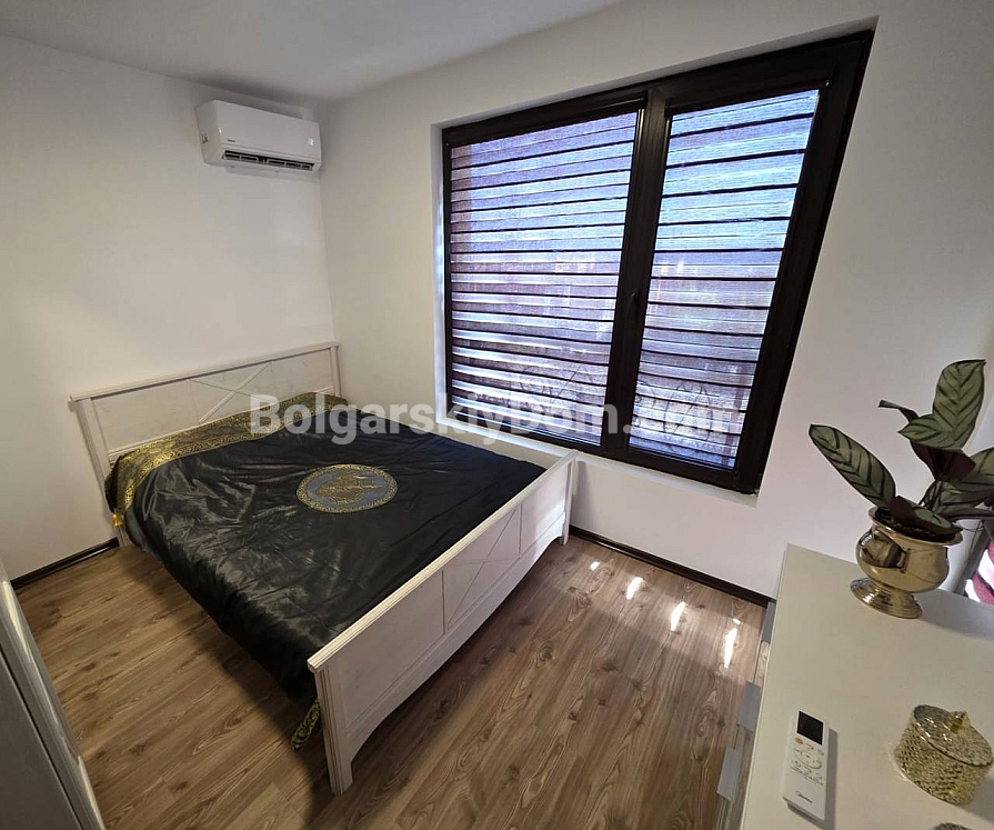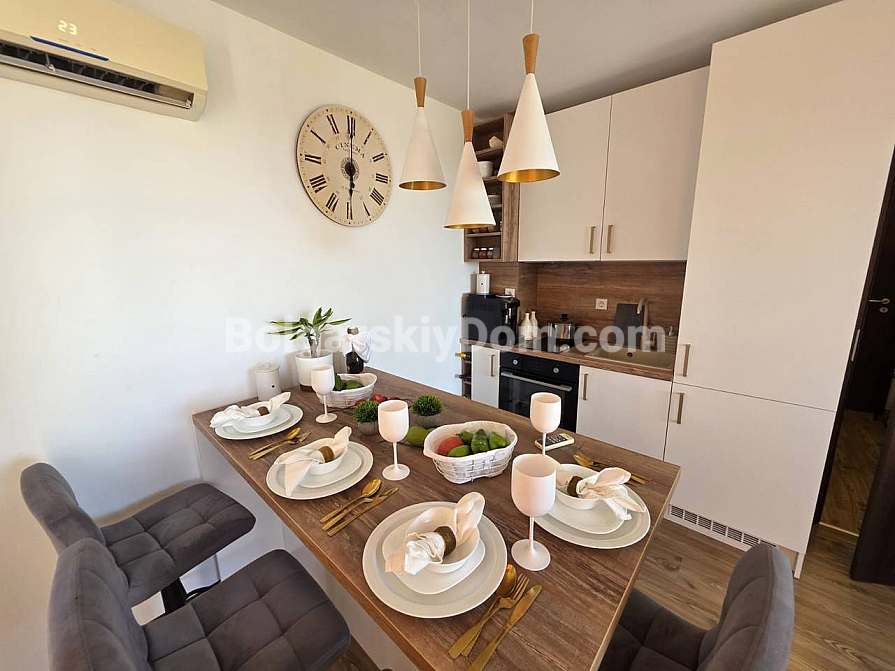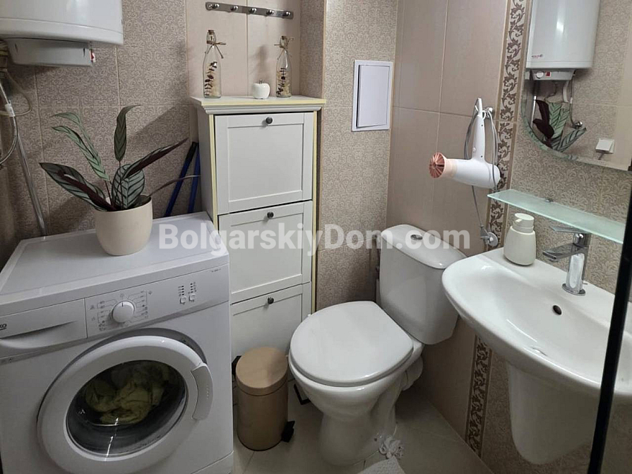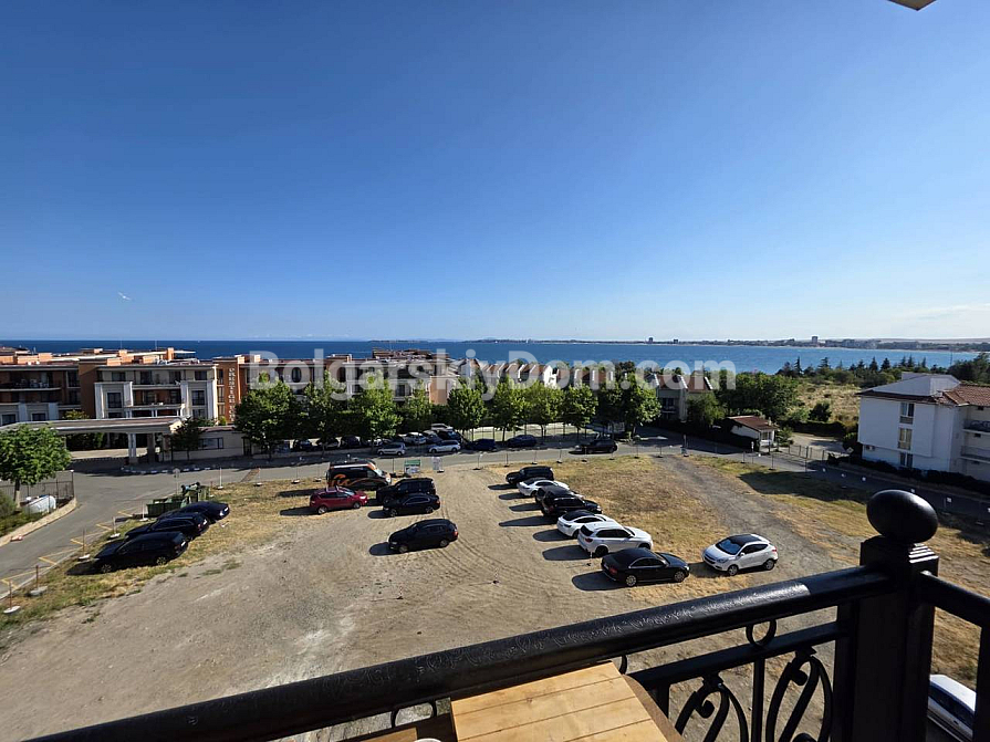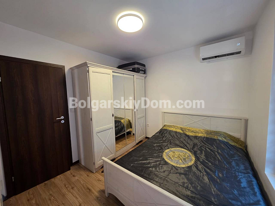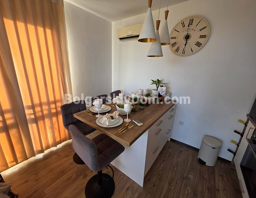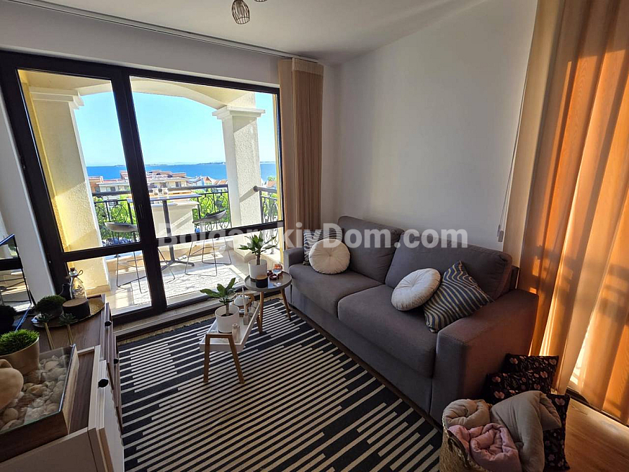 Компанія Болгарський Дім пропонує об’єкт, який не потребує довгих презентацій: це готова до життя квартира в престижному Святому Власі з гарантованим видом на море! Пропонуємо світлий апартамент площею 54 кв.м., розташований на п’ятому поверсі сучасного ЖК Морскі Бряг. Тут уже все продумано, тож вам не доведеться додатково вкладати кошти в облаштування: у просторій вітальні – панорамні вікна, стильний диван і вихід на терасу, де можна снідати з видом на море. Кухня-студія оснащена сучасним гарнітуром, вбудованою технікою та дерев’яними акцентами. У квартирі встановлені кондиціонери в обох кімнатах, а у спальні на вас чекає велике двоспальне ліжко та простора шафа з дзеркалами.
