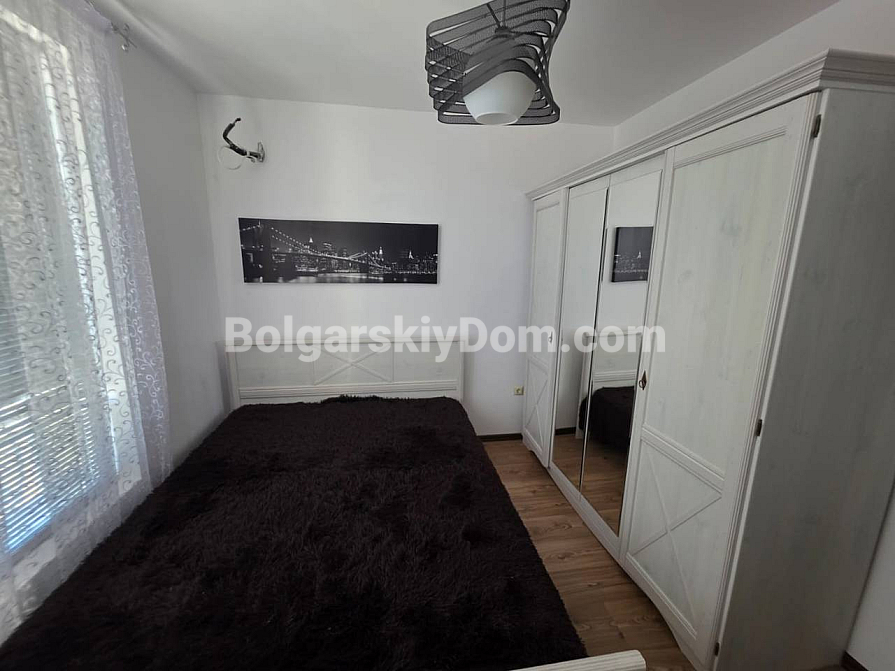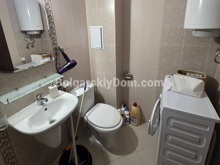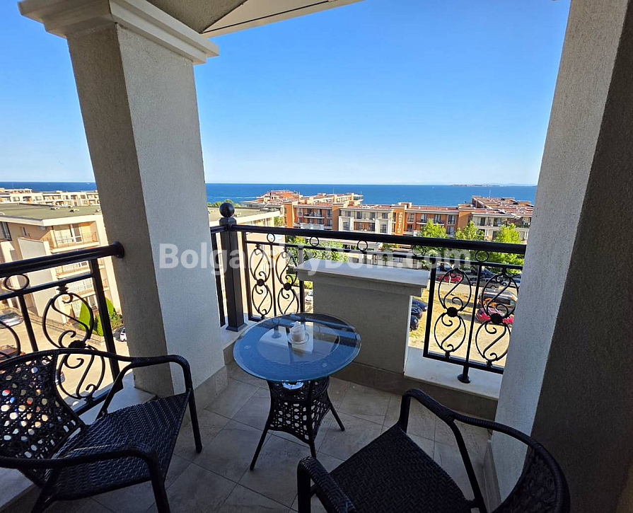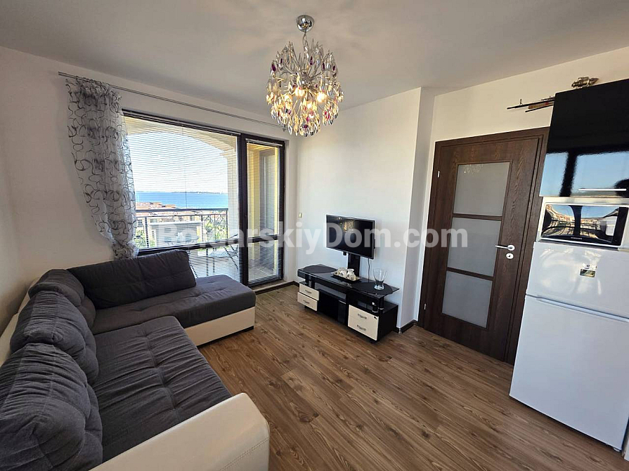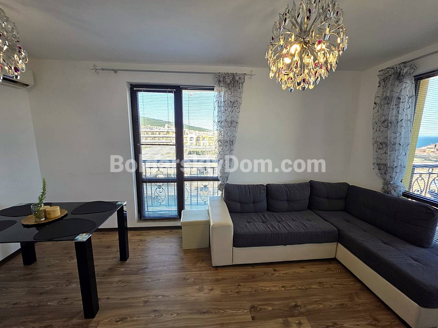 У каталозі компанії Болгарський Дім з’явився преміальний об’єкт із захопливим видом на море! У сучасному житловому комплексі Морски Бряг у престижному курорті Святий Влас пропонується до продажу двокімнатний апартамент площею 54 кв.м., розташований на шостому поверсі. Квартира повністю мебльована та має стильний, сучасний інтер’єр у світлих тонах, наповнений світлом завдяки панорамним вікнам. Серце квартири — вітальня-кухня з сучасними глянцевими чорними фасадами та вбудованою технікою. Зона відпочинку обладнана кутовим диваном, телевізором і виходом на балкон, де встановлений затишний столик для ранкової кави з прямим видом на море та комплекс. У спальні просторе ліжко, багато місця для зберігання речей і великі вікна з легкими шторами. В обох кімнатах встановлені кондиціонери. Наявність ліфта та повна готовність житла роблять його гідним варіантом для комфортного відпочинку чи проживання.