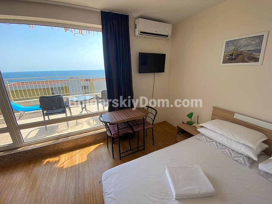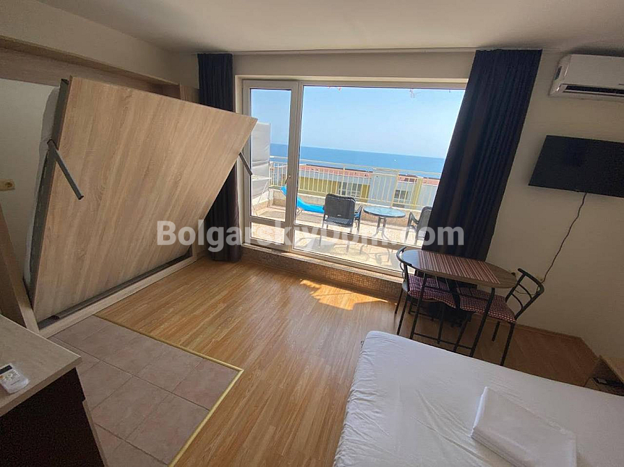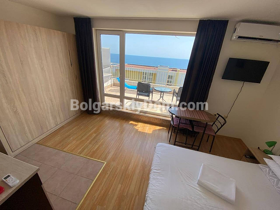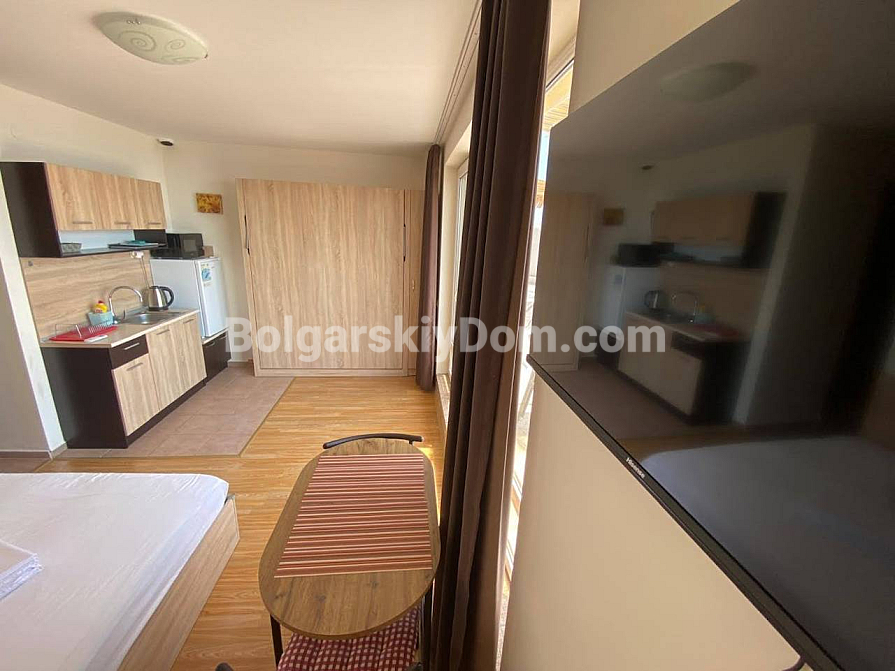 Увага-увага! АН Болгарський Дім пропонує вам не просто квартиру, а абонемент у наймасштабніший курортний комплекс Святого Власа! Це студія в Краун Форт Клуб – частині грандіозного Форт Нокс Гранд Резорт – з приголомшливим панорамним видом на море. Апартамент площею 41 кв.м. розташований на шостому поверсі та повністю готовий до вашого приїзду. Житловий простір продуманий до найменших деталей: є комфортна зона з двоспальним ліжком і обіднім столиком, компактна кухня у світлих тонах, обладнана всім необхідним (холодильник, мікрохвильовка), а також просторий санвузол. Головна «родзинка» – це велика тераса з прямим видом на море, де вже розміщені зручні крісла та шезлонг. Встановлений кондиціонер та містка шафа для зберігання.