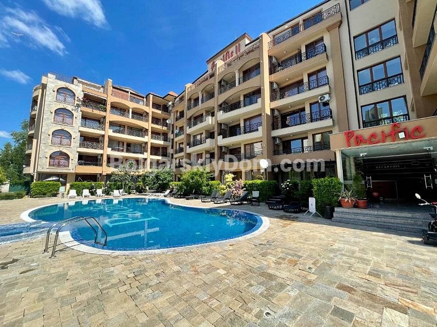 Житловий комплекс «Пасифік» розташований у північно-західній, практично центральній частині курорту, лише за 600 метрів від моря. На доглянутій території мешканцям доступні відкритий басейн із дитячою зоною, ресторан, паркінг та охорона. Шестиповерхова будівля оснащена сучасним безшумним ліфтом. Поруч — ресторани, бари, магазини, а також широкий вибір водних розваг: прогулянки на яхті, риболовля тощо. Річна такса обслуговування для такої площі становить лише 10 євро за кв.м. Така простора квартира в центральному районі — вигідна покупка.