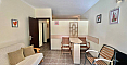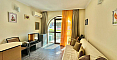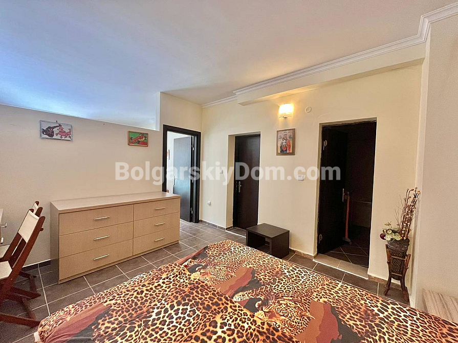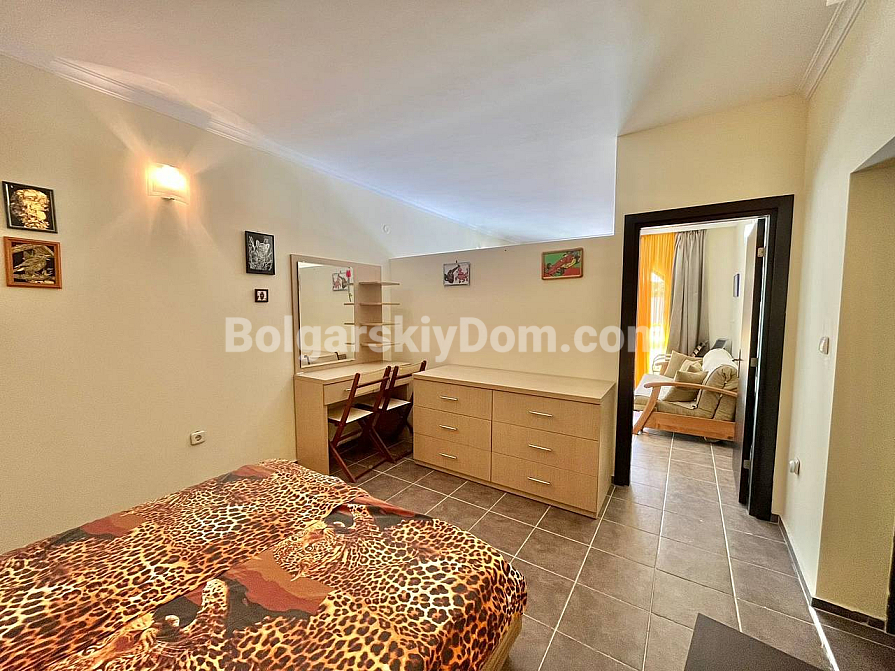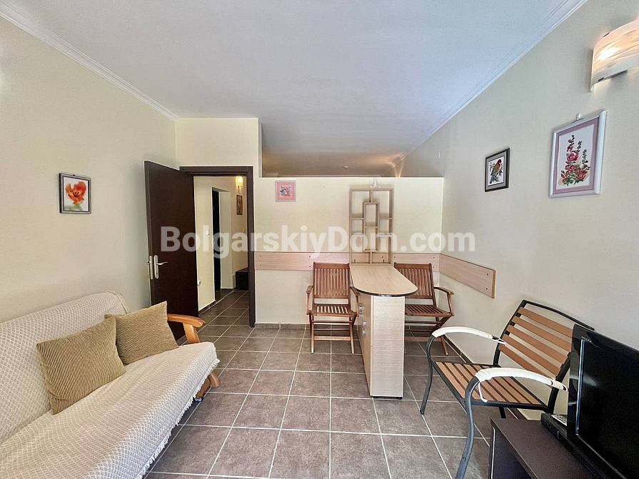 Пропонуємо вашій увазі нестандартну та простору студію з капітальним зонуванням у комплексі St. George Plaza — чудова пропозиція за вигідною ціною у Святому Власі. Цей апартамент площею 55 кв.м розташований у активно розвиненій частині курорту та за функціоналом відповідає повноцінній two-bedroom квартирі, оскільки зона спальні відокремлена капітальною стіною. Планування включає сонячну вітальню, окрему спальню, ванну кімнату з туалетом, пральну зону та чарівне арочне вікно, що додає інтер’єру особливого шарму. Кухонного блоку наразі немає, проте квартира повністю мебльована та готова до заселення.