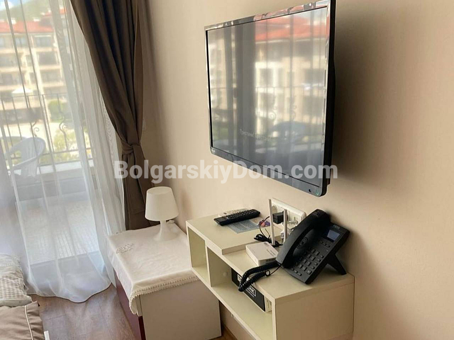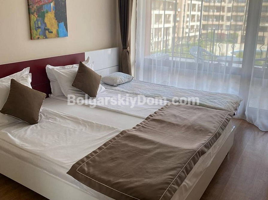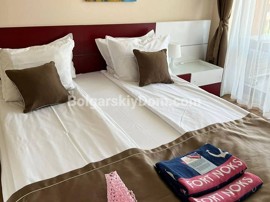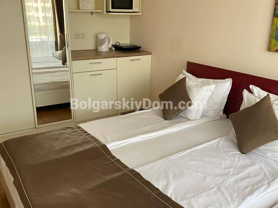 Агентство Болгарський Дім представляє ексклюзивний лот на першій лінії: затишну студію в апарт-комплексі Premier Fort Beach. Ці апартаменти є ідеальним рішенням для швидкого старту в орендному бізнесі, оскільки вони повністю мебльовані та готові до заселення. Світлий інтер’єр у спокійних тонах створює приємну атмосферу для відпочинку: тут є зручне двоспальне ліжко, функціональна міні-кухня з мікрохвильовою піччю, а також сучасна ванна кімната з душовою кабіною. З балкона відкривається приємний вид на внутрішній двір комплексу, де можна насолоджуватися ранковою кавою. Площа 39 кв.м, до моря одна хвилина пішки.