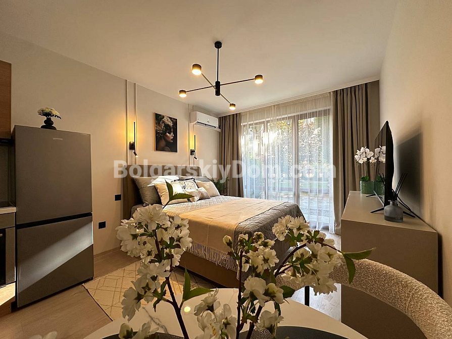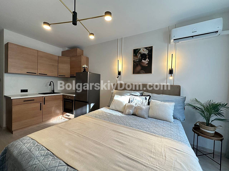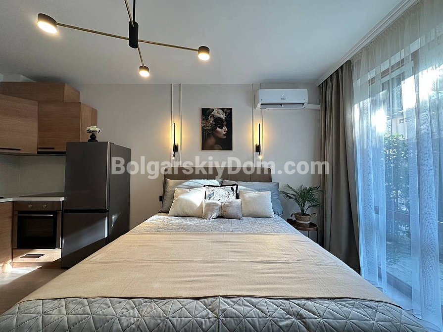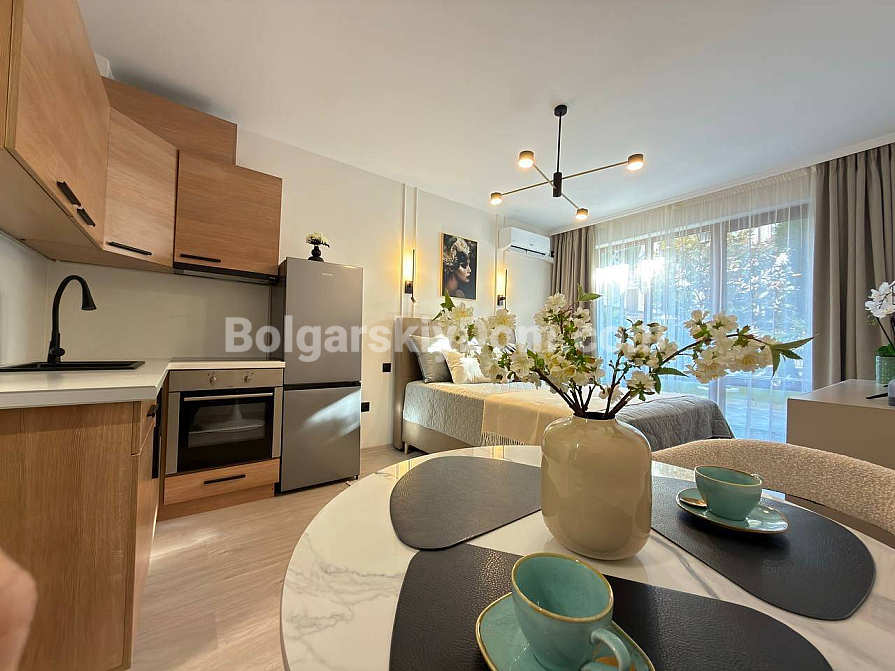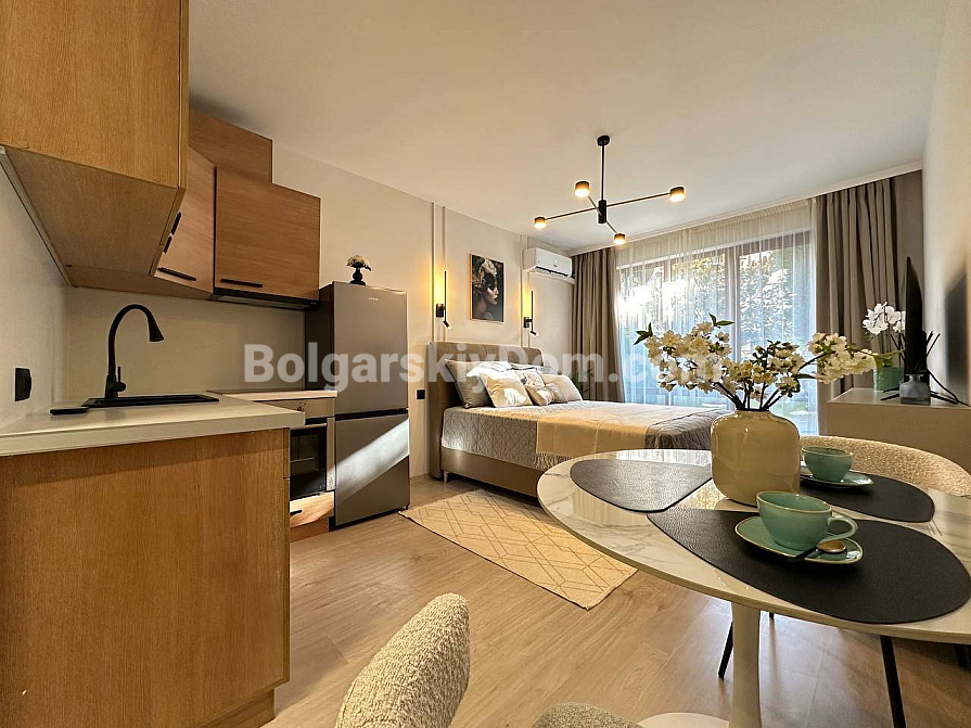 Шикарна ексклюзивна пропозиція від агентства "Болгарський дім " - стильна і затишна квартира-студія з атмосферою справжнього курорту. Апартамент на партері з прямим виходом у внутрішній двір комплексу до басейну — рідкісне і дуже зручне рішення. Простора тераса з видом на пальми і квітучі магнолії створює відчуття відпочинку в хорошому середземноморському готелі. Ранкова кава під шелест листя і м'яке морське повітря — тут це стане вашою повсякденністю. У квартирі виконаний свіжий ремонт: пофарбовані стіни, покладений ламінат. Інтер'єр продуманий до дрібниць: 40 кв.метрів простору організовані функціонально, зручно і естетично. Повністю оновленi меблі: ліжко з ортопедичним матрацом, комод, столовий гарнітур, дзеркальна шафа в передпокої і сучасні світильники. Нова техніка готова до експлуатації: телевізор, кондиціонер, пральна машина, холодильник, душова кабіна.