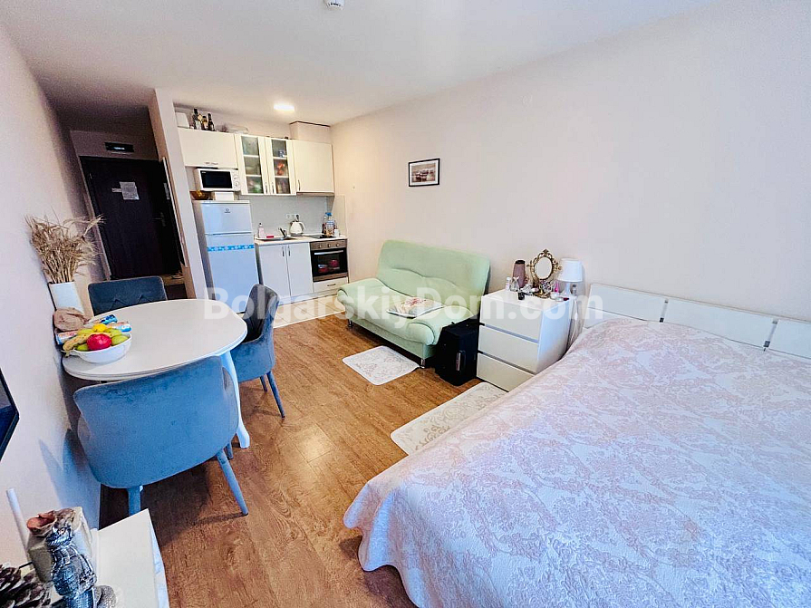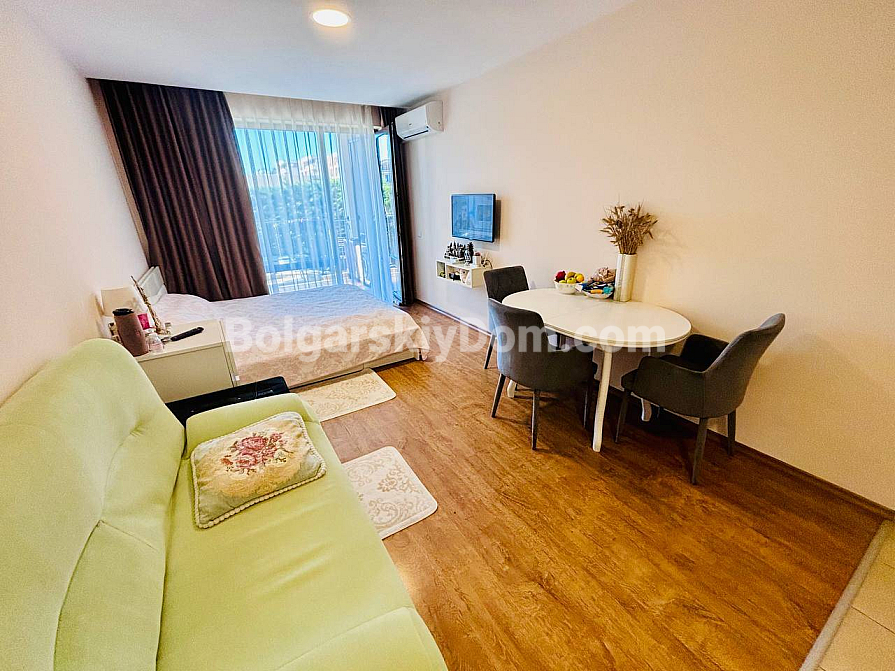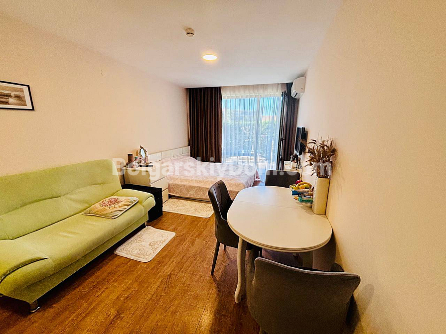 Студія з видом на море у Святому Власі – нове поповнення каталогу агентства Bolgarskiy Dom! 45 кв.м на третьому поверсі в Premier Fort Beach, балкон із панорамою моря, ліфт і паркомісце. Квартира повністю мебльована та укомплектована: диван, ліжко, обідня зона зі столом і стільцями, телевізор, кондиціонер, паркет у хорошому стані. Усе готово – можна заселятися або здавати в оренду вже цього сезону. Святий Влас із його стабільним попитом на оренду дозволяє швидко повернути вкладення.