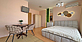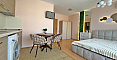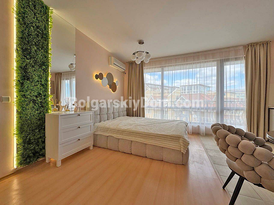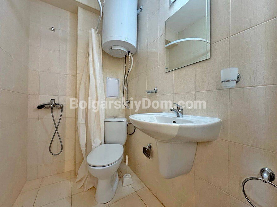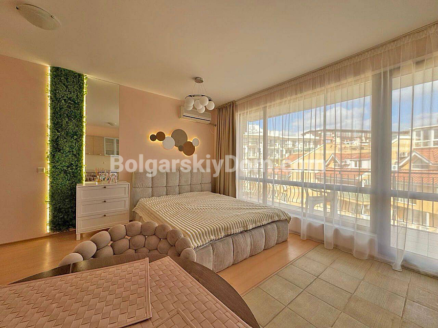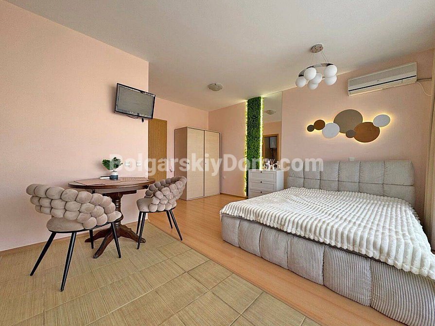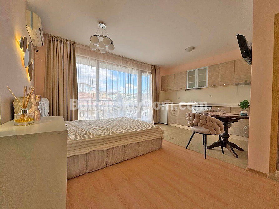 Стильна та вигідна пропозиція від Болгарського Дому! Сучасна студія в популярному комплексі Даймонд Бей у центрі Сонячного Берега. Апартамент розташований на 4-му поверсі шестиповерхової будівлі з ліфтом, площа 40 кв.м, відкрите планування: простора кімната, де гармонійно поєднані кухонна зона (з плитою, холодильником і шафами), велике двоспальне ліжко та зона відпочинку, сучасний санвузол із душем, а також місткий балкон для відпочинку з видом на комплекс. Студія у відмінному стані: приємний свіжий ремонт, стильні меблі високої якості, вся необхідна електротехніка та побутова техніка вже встановлені — можна заїжджати та жити без додаткових робіт!