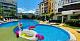 Комплекс Даймонд Бей — закритого типу в спокійній північній частині курорту, але з чудовою доступністю: великий відкритий басейн із дитячою зоною, шезлонги та парасольки для засмаги, ресторан із баром, лобі, цілодобова охорона, відеоспостереження, доглянута зелена територія та паркінг. Річна такса підтримки — лише 8 євро за кв.м (одна з найнижчих у районі для комплексу з басейном і повним сервісом). До піщаного пляжу близько 400–450 метрів пішки, поруч супермаркети (включно з Lidl), ринок, аптеки, кафе та зупинки транспорту — вся курортна інфраструктура у пішій доступності. Щоб забронювати перегляд і обговорити ціну, напишіть нам!