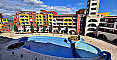 Marina Cape — масштабний елітний комплекс-мінікурорт із власною яхтовою пристанню: кілька басейнів (у тому числі дитячі), зелені зони для прогулянок, 4 ресторани, кафе та бари, супермаркет, магазини, СПА-центр (сауни різних типів, джакузі, масаж, салон краси, фітнес, медпункт). Також є дитячий центр з ігровим майданчиком, охоронювана парковка, цілодобова охорона та відеоспостереження, консьєрж. Відстань до піщаного пляжу всього 100 метрів — прямий вихід до моря та спокійна бухта без натовпів. Район Ахелой тихий, але водночас лише 8 км до Сонячного Берега та 20 км до аеропорту Бургаса. Річна такса підтримки — 12 євро за кв.м. (включає басейни, прибирання, охорону та обслуговування території).
